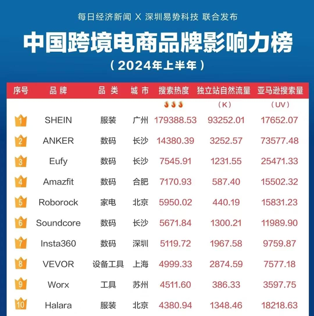 同时,在每日经济新闻和深圳易势科技联合发布的《中国跨境电商品牌影响力榜(2024年上半年)》榜单中,Anker也夺得了Top2的位置,搜索热度为14380.39,独立站自然流量为3252.57,亚马逊搜索量为73577.48,排名仅次于全球知名时尚品牌SHEIN。