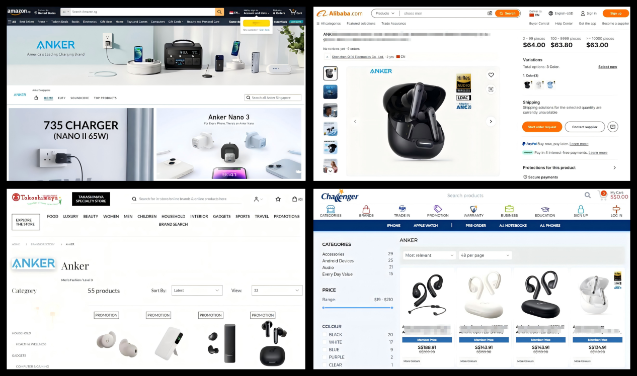 Anker除了布局海外社媒外,也将旗下产品上架了亚马逊、阿里巴巴国际站、Takashimaya(日本大型连锁店)、Challenger(新加坡电子产品连锁零售商)等海外电商平台,进行多渠道销售。