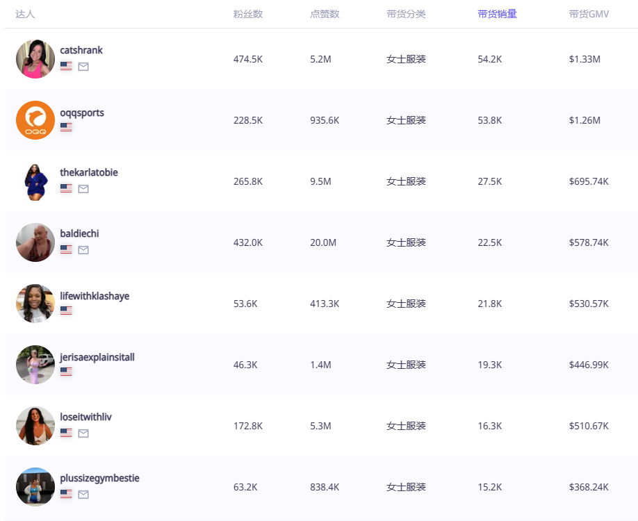 从下列OQQ品牌关联的带货达人中我们可以看到,这些达人的粉丝数量并不高,但是销售额却都很可观。