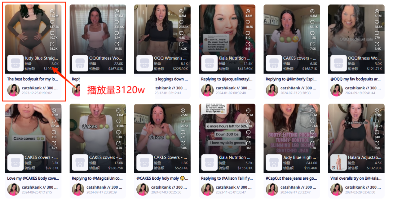 例如OQQ带货销量最高的TikTok达人@catshrank,她的粉丝数为47.5w,虽然只是TikTok腰部达人,但是爆款带货视频的数量却很多,几乎每条都超过了百万播放量,其中最高的一个视频播放量达到了3120万,并且达人总GMV值达到133万美元,甚至超过了官方账号的数据。