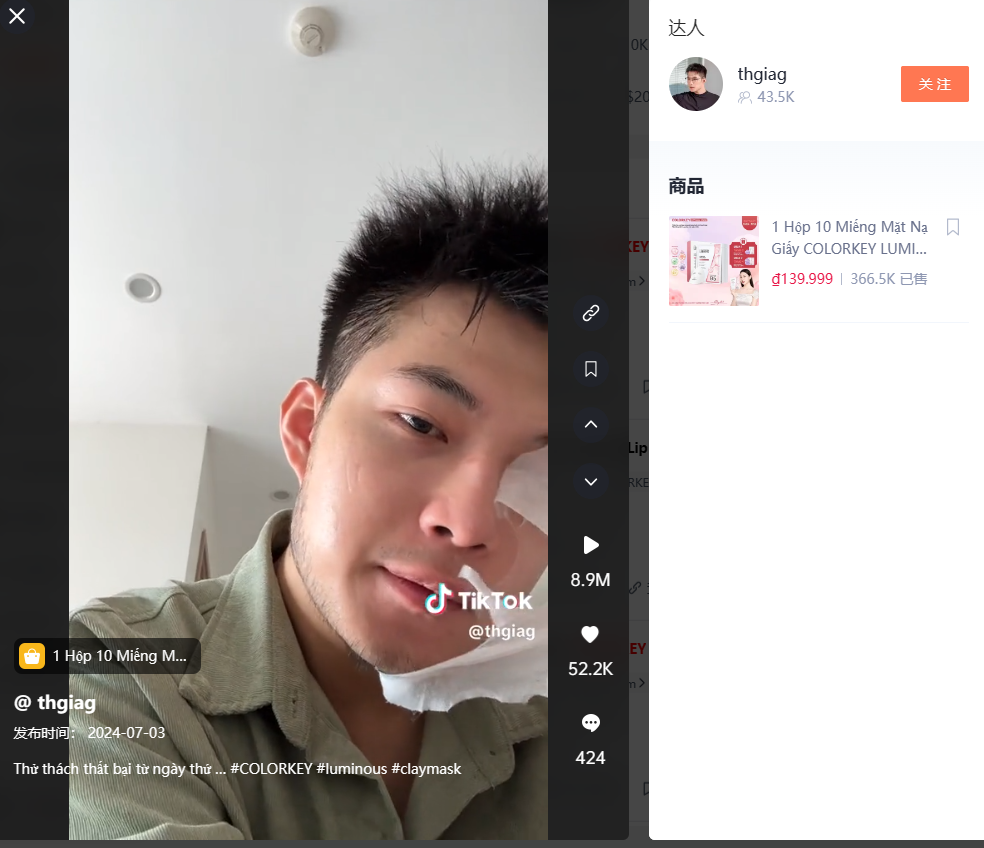 据兔克了解,Colorkey在TikTok上面的官方账号共有4个,其中有两个是越南账号,另外两个则是印尼以及马来西亚,主要市场集中于越南。