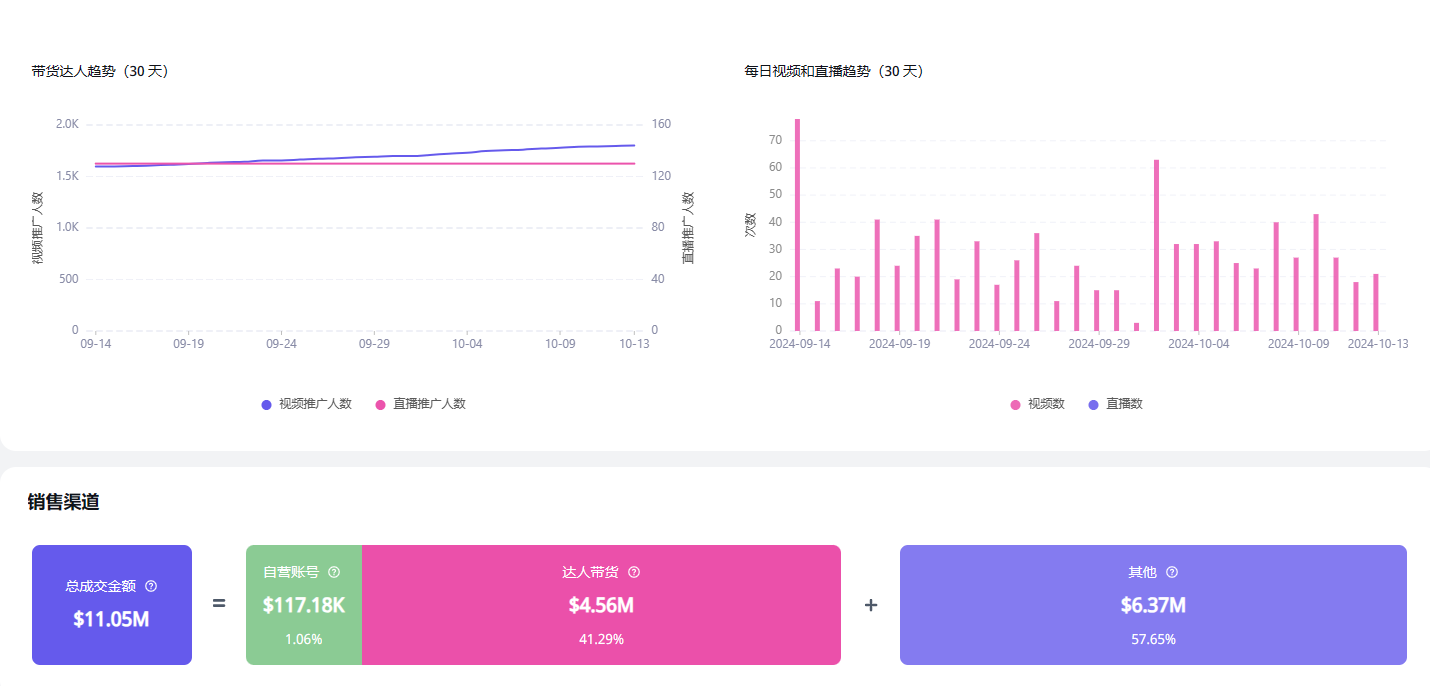 据兔克了解,Colorkey在TikTok Shop的主要销售渠道来源于达人带货,这一点从销量最高的店铺COLORKEY Việt Nam的数据中就可以看出,店铺共计关联3300个TikTok达人,在总成交额1105万美元的情况下这些达人带货的销量占据了将近一半的份额,说明达人营销对于Colorkey这样的品牌来说是非常重要的。