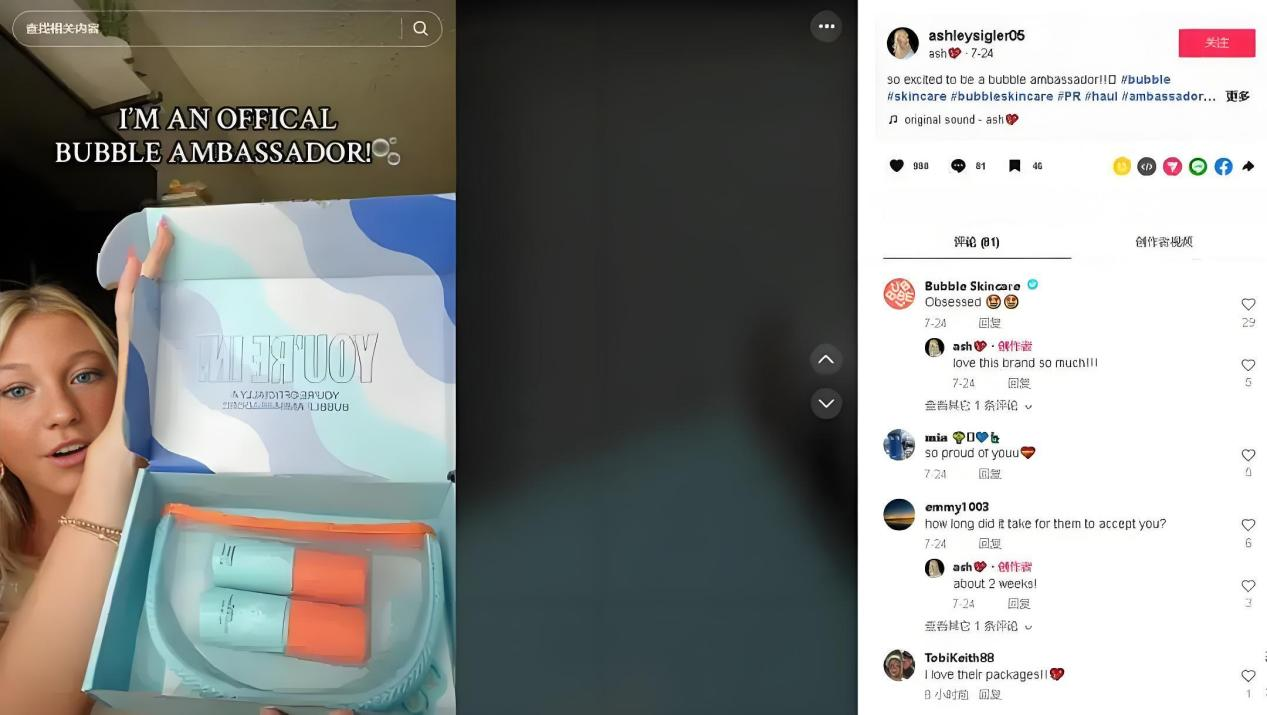 Bubble Skincare还通过与护肤领域的达人合作,借助达人的影响力来推广产品,展示真实消费者的使用体验,进一步增强品牌的社区感,从而有效扩大在TikTok上的受众群体。