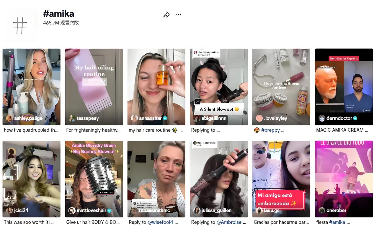 话题标签#amika在TikTok上的热度不错,观看量已突破465万次。