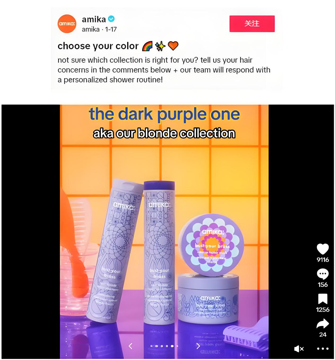 在Amika的TikTok主页上,有一条播放量达到约12万的视频。该视频以“选出属于你的颜色”这一醒目标题为引导,配以展示多彩品牌色不同系列的推介内容,成功吸引了网友们的关注。