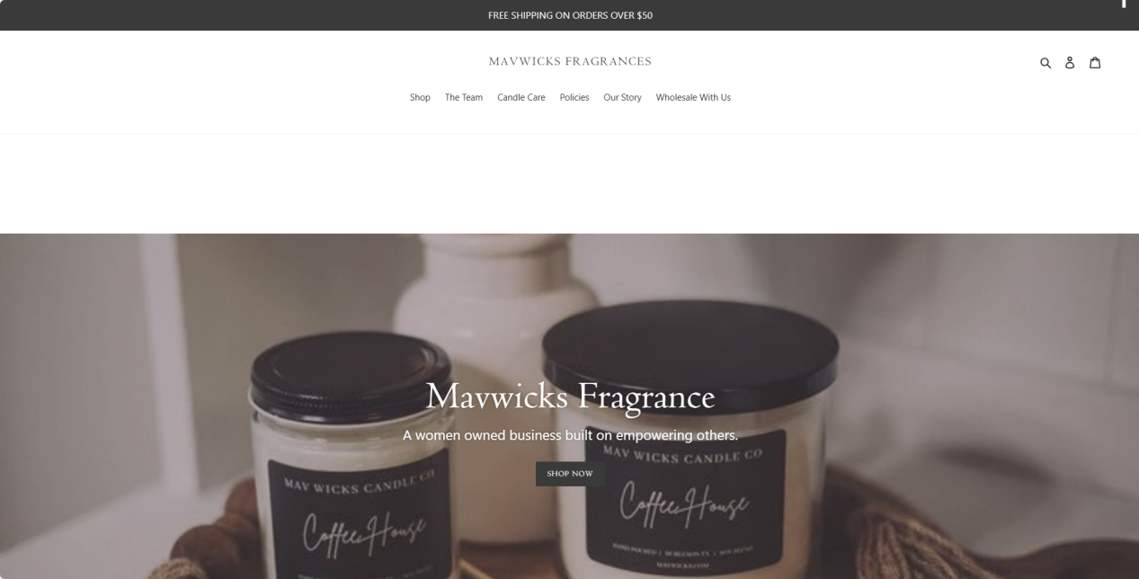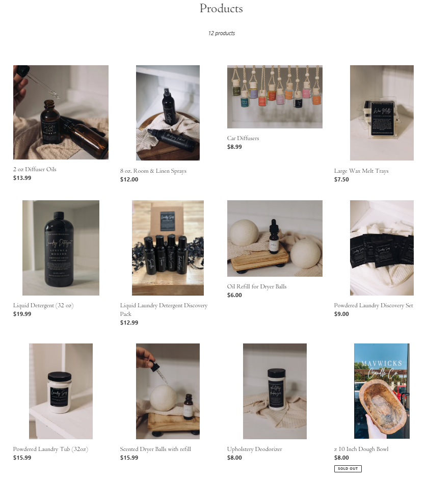 除了TikTok,Mavwicks Fragrances还搭建了品牌的独立站,其简洁而精致的布局吸引了不少访客。网站首页精选展示了11件主打商品,每一件都以简约的背景呈现,这种设计选择不仅让产品本身成为焦点,也传递出品牌对自然纯粹美学的追求。