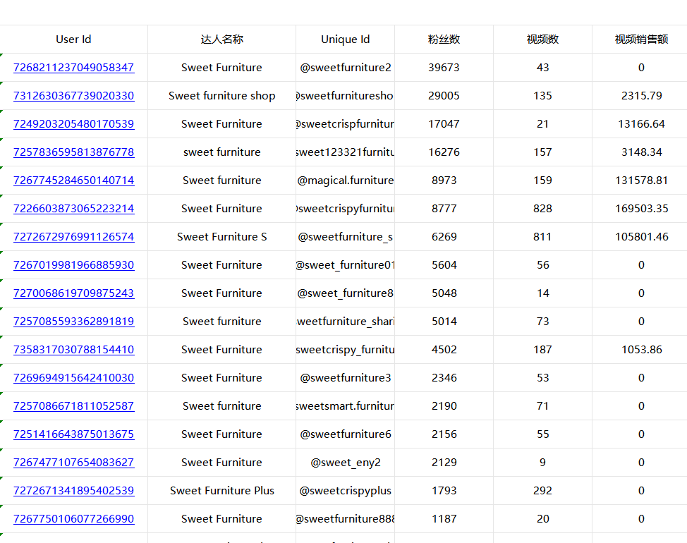 Sweet Furniture在TikTok Shop的推广达人 图源:Echotik