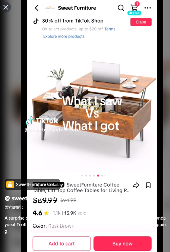 例如账号@sweetcrispyfurniture发布的一条播放量达到630万的带货视频,就是通过在视频封面上使用了对比性的提示语“我看到的 VS 我得到的”以及配合“网络星期一”的促销标签和“通过TikTok小店购买立享7折”的优惠信息,这种策略有效地激发了用户的好奇心,吸引他们点击视频深入了解。