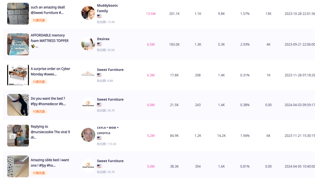 除此之外,Sweet Furniture还会为创作内容进行付费投流,播放量较高的几个视频里都有广告投流,从整体数据上来看,这种方法的确能为产品创造曝光机会,实现销量的增长。