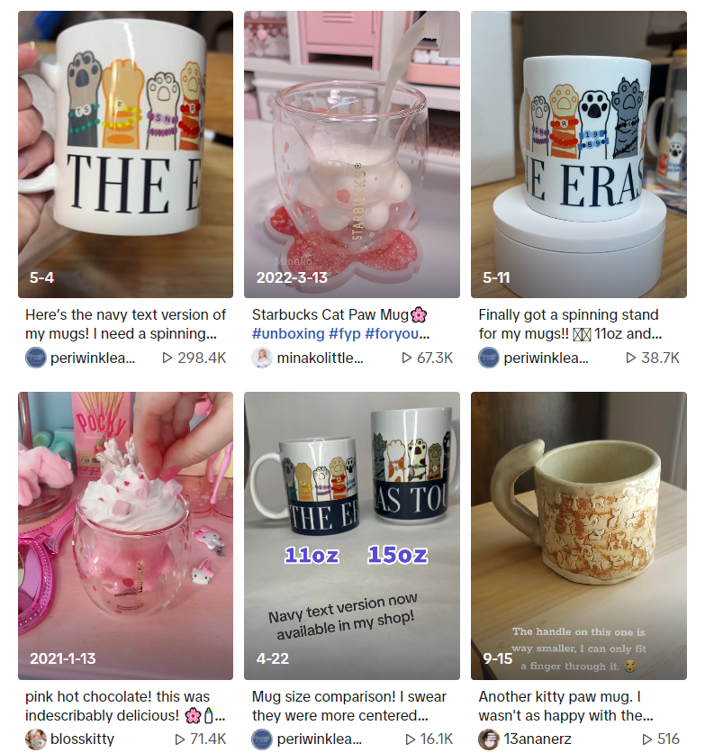 此外,某品牌推出的“猫爪杯”更是因其独特造型而爆红网络。最初仅作为日系创意小商品的“猫爪杯”被一些TikTok用户分享,吸引了年轻人争相购买。