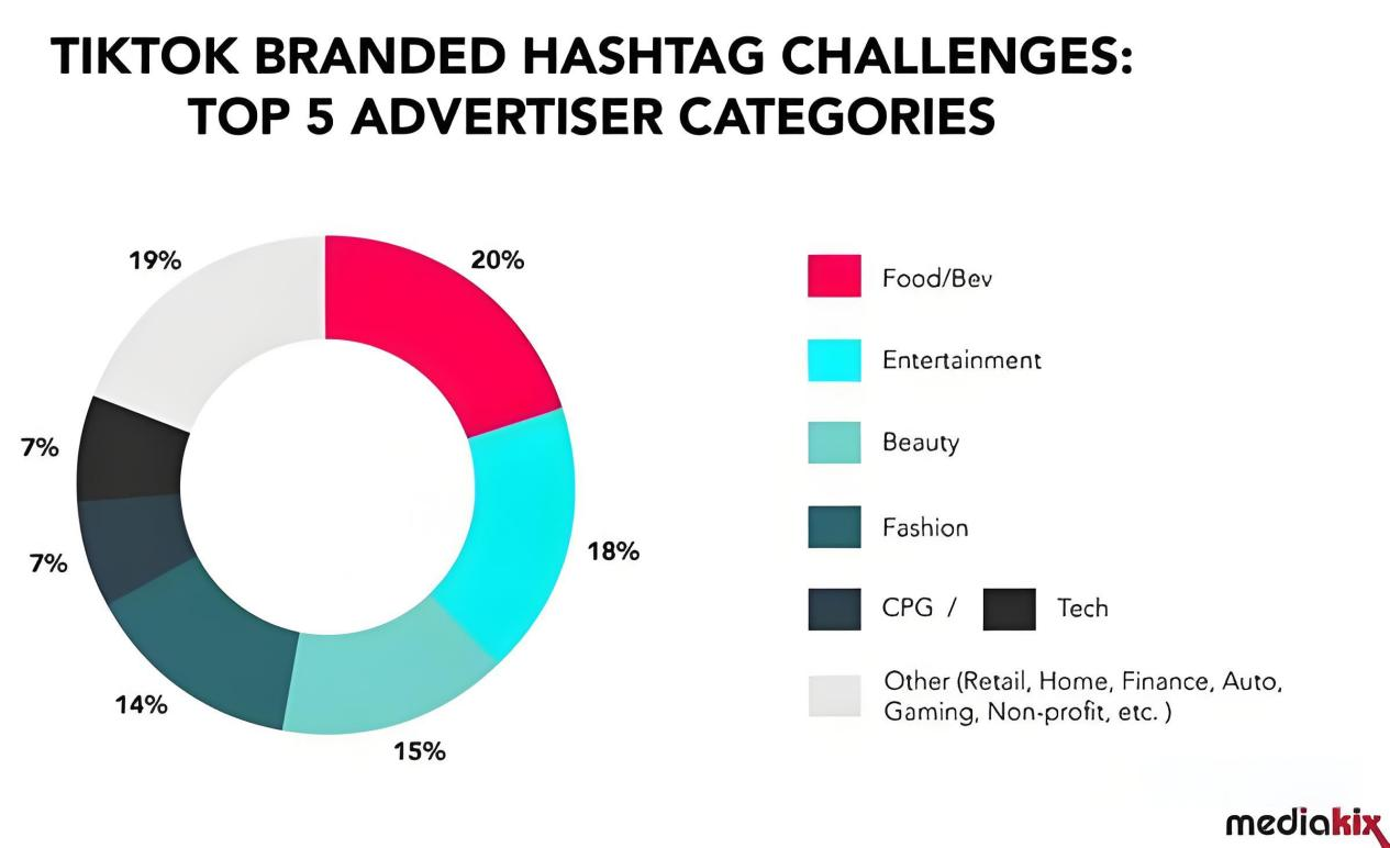 根据Mediakix的数据分析,我们可以看到,食品、娱乐、美妆及时尚类品牌在TikTok挑战赛中扮演着主要推动者的角色,它们的广告投放总额占据了近70%的市场份额。