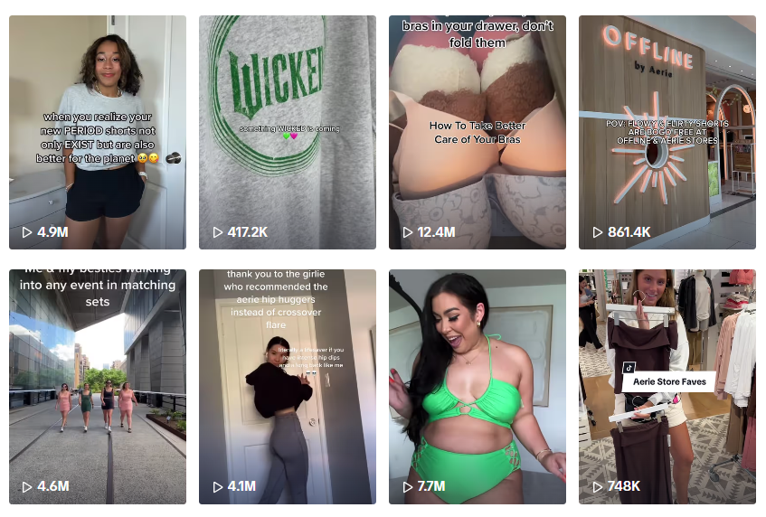 品牌在TikTok上最初的吸引力往往来自独特的IP和内容风格,在TikTok上打出自己的风格,越与众不同,越容易脱颖而出。比如,美国的服装品牌Aerie,靠真实无修图的风格吸引了大量粉丝。品牌调性可以走“亲民”路线,或“轻奢”,重点是精准锁定目标用户,不用让所有人都喜欢,但要抓住那部分“有缘人”。