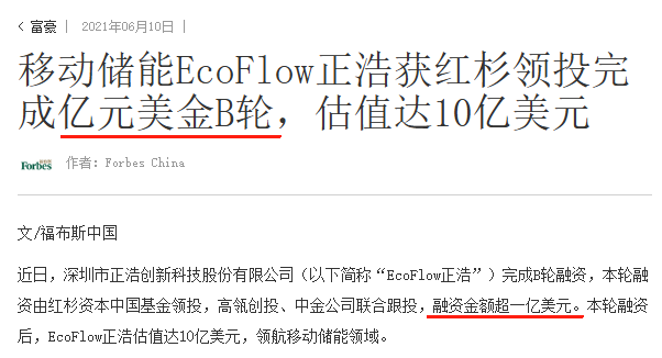 2021年6月10日,正浩EcoFlow完成了B轮融资,本轮融资由红杉资本中国基金领投,高瓴创投、中金公司联合跟投,融资金额超1亿美金。
