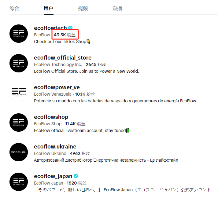 正浩EcoFlow多个TikTok账号截图