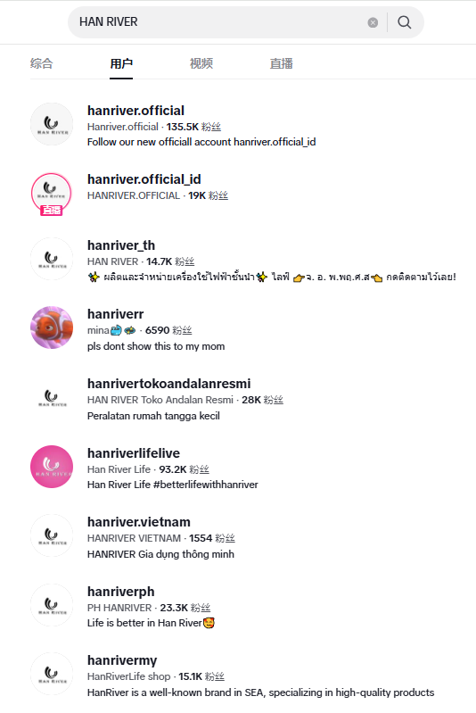 目前,HAN RIVER品牌在TikTok平台上的多个账号累计吸粉超过32万。其中,主账号@hanriver.official以13.55万的粉丝量暂居首位;排在第二位的是@hanriverlifelive,拥有9.32万的粉丝;排在第三位的是@hanrivertokoandalanresmi,粉丝量也超过了2.8万。