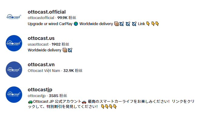 OTTOCAST品牌在TikTok上的策略采取了多账号布局的方式,针对不同地区的市场需求和用户喜好,制定差异化的内容策略。