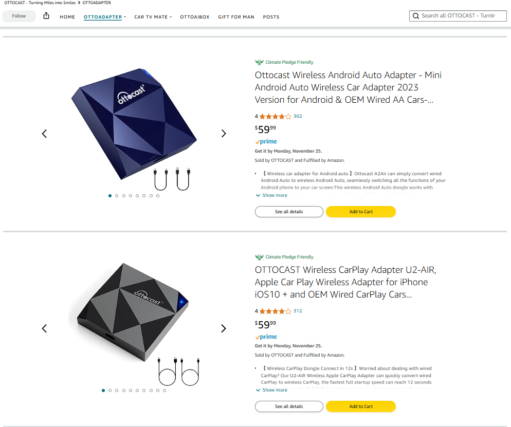 除了社交媒体宣传,OTTOCAST品牌在销售渠道的布局上也很用心。他们选择在亚马逊等主流电商平台销售,同时建立了海外独立站,为用户提供更多详细的产品信息和直接购买渠道。