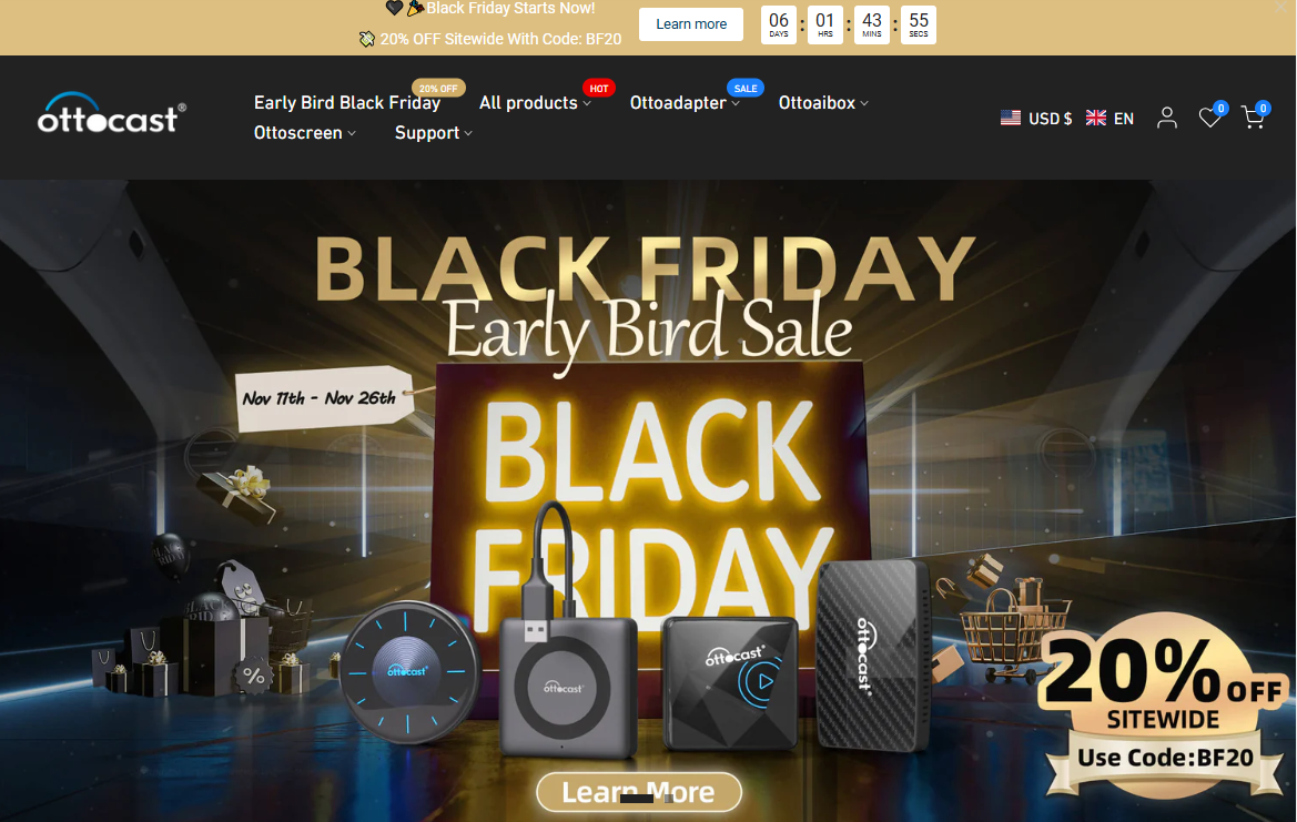 在独立站的运营中,OTTOCAST品牌充分利用节日促销活动吸引用户。例如,在2024年黑五期间(11月17日 - 11月26日),该品牌独立站推出了全站20%折扣的“Early Bird Sale”活动,并通过倒计时功能营造紧迫感,吸引用户迅速下单。