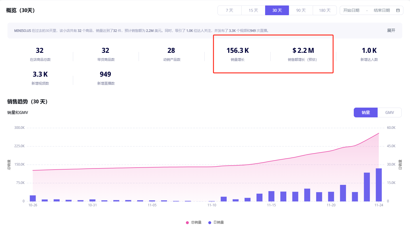 过去30天内,MINISO共关联发布超过3300条短视频,并举办了949场直播。