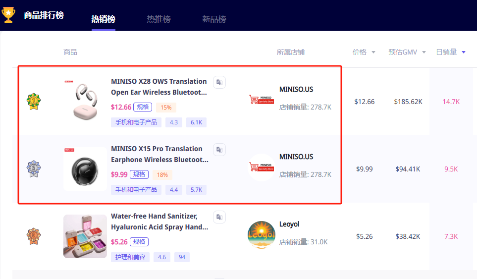 据EchoTik数据显示,过去30天内,MINISO美区小店MINISO.US销售额突破220万美元,单周销量达130万美元,旗下两款翻译耳机上架仅几个月便跃升为热销榜前二。