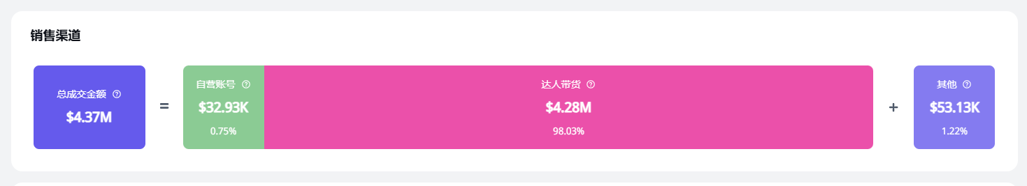 从下面这张销售渠道分析图中可以看到,达人带货占据了98.03%的比重,可谓是整体营销计划中近乎全部的份额。