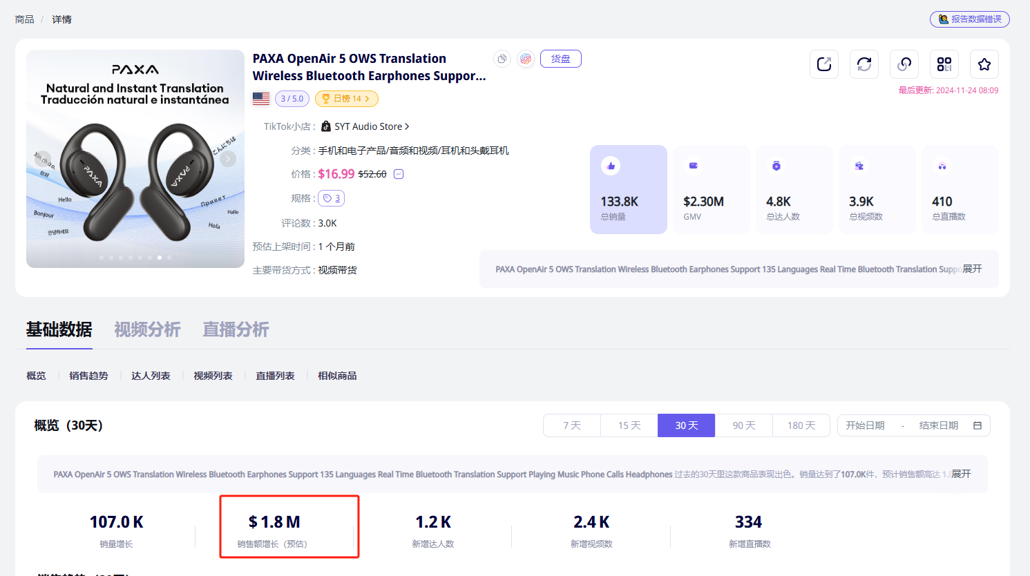 与MINISO一样的,还有SYT Audio Store小店。这家小店同样经营3C智能电子设备,旗下一款开放式翻译耳机售价不到30美元,在TikTok美区大受欢迎。近30天销售额达到180万美金,占据TikTok热销商品榜单第14位。