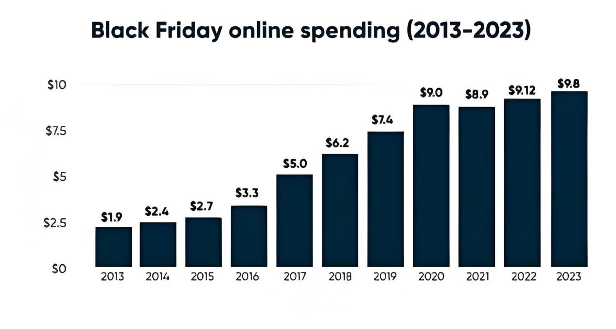 根据Adobe Analytics的数据显示,2023年黑五销售额达98亿美元,创下历史新高。2024年,这一数字预计将进一步增长,达到108亿美元。