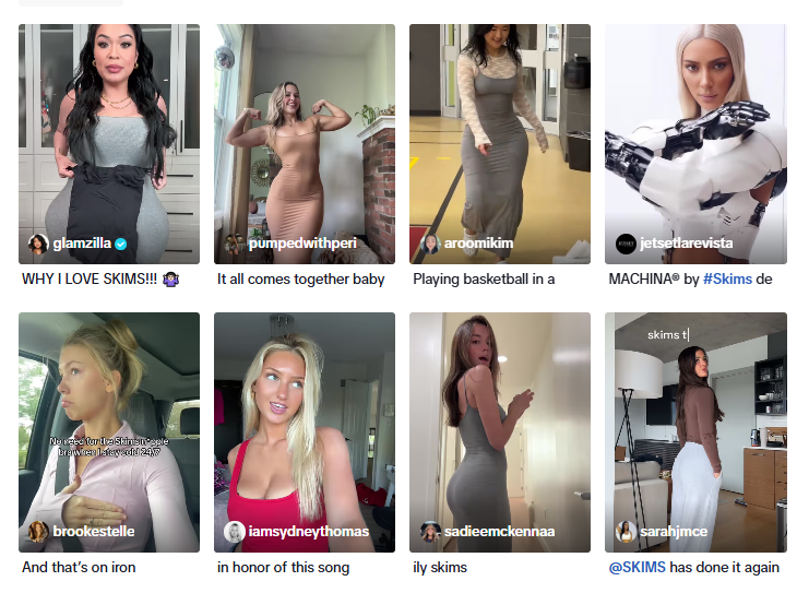 Skims凭借#SkimsBodyChallenge大获成功。品牌鼓励用户展示自己穿着Skims产品的独特穿搭风格,强调舒适性和适合各种体型的设计。这一挑战极大地激发了用户的创作热情,尤其是在多元体型的女性群体中,引发了广泛的共鸣和参与。Skims借此活动提升了品牌认知度,并建立了与消费者的深度互动关系。