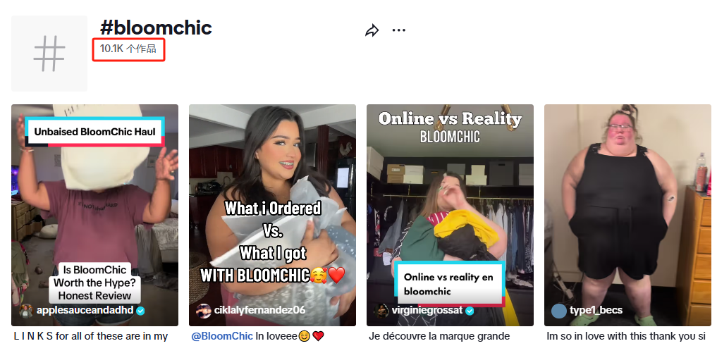 其中,品牌话题标签#bloomchic发挥了重要作用,截至目前已积累了1.01万条作品,这为品牌带来了广泛的曝光和持续的流量。
