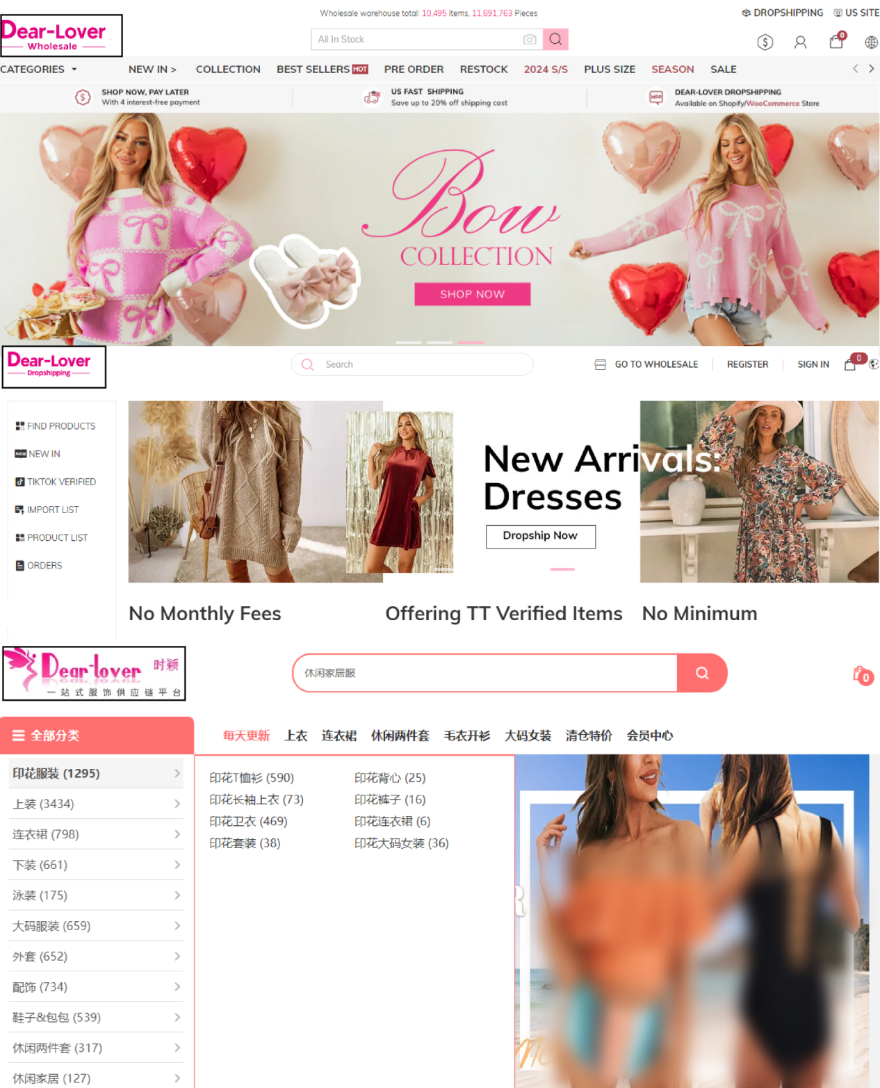 新时颖服饰公司主要有三个网站,Dear-Lover Wholesale、Dear-Lover Dropshipping,以及Dear-Lover一站式服饰供应链平台。