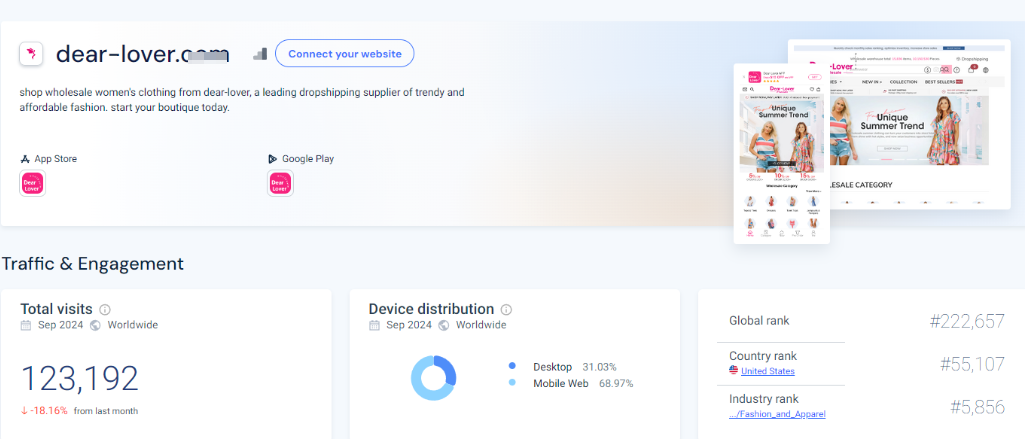 从数据来看,Dear-Lover独立站的流量十分不错,9月份其流量为12万+。