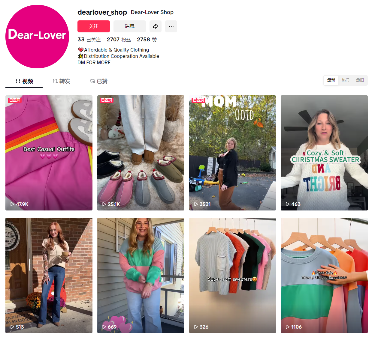 TikTok也是Dear-Lover的营销阵地,不过粉丝表现不如Facebook,一个账号粉丝为3026,一个账号粉丝为2707。视频内容同样是展示真实的穿搭效果为主。