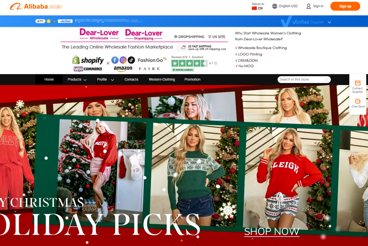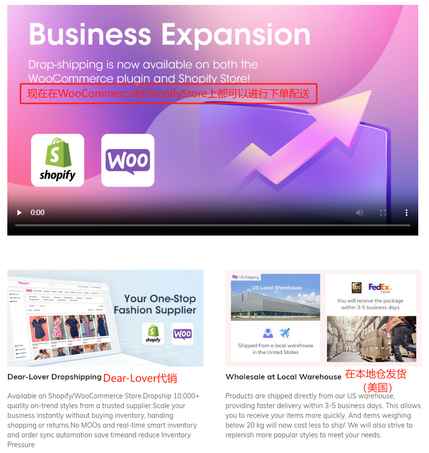 其中,Dear-Lover Wholesale可以看作是他们的海外独立站,进入后可以直接购买看中的服饰,设计风格偏向C端用户,也可以通过该网站跳转到Dear-Lover Dropshipping(内容为英文)和Dear-Lover一站式服饰供应链平台(内容为中文)上,进行代销采购,这两个网站的设计风格更简练直接,偏向于服务B端客户。
