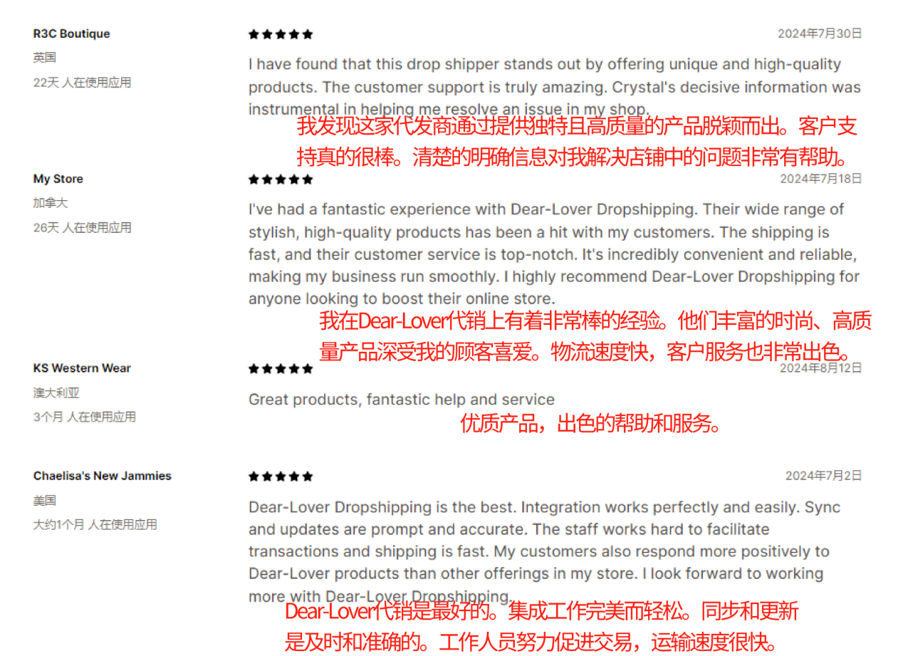 还有一位美国客户评价道:“Dear-Lover代销是最好的。集成工作完美而轻松。同步和更新是及时和准确的。工作人员努力促进交易,运输速度很快。”