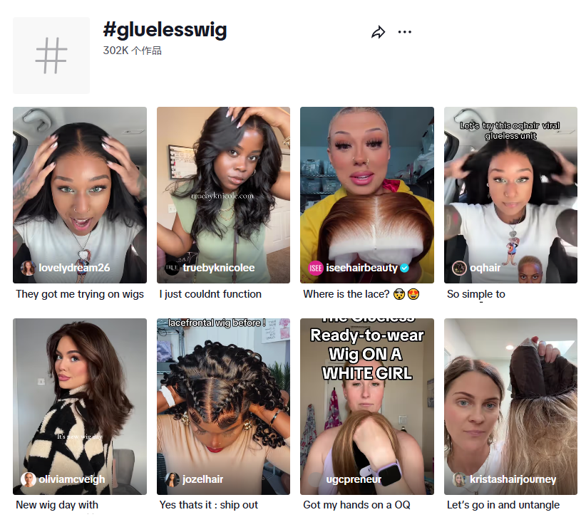 Luvme Hair品牌还通过发起挑战话题(例如#gluelesswig)和福利活动,鼓励用户参与内容创作。