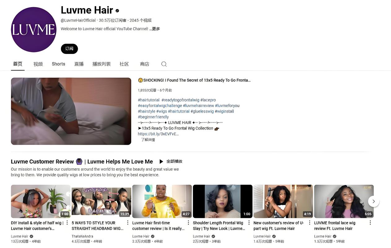 YouTube作为全球最大的视频分享平台,同样是Luvme Hair品牌进行深度内容营销的重要渠道。品牌通过自有频道和与红人合作的双线策略,不断扩大品牌影响力,赢得了更多消费者的信赖。