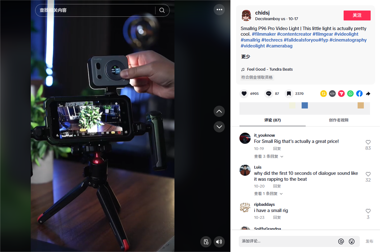 比如,在TikTok拥有40.3万粉丝的达人@chidsj,他发布的关于Smallrig P96 Pro Video Light的使用视频,通过真实的场景模拟,该视频获得了86.55万的播放量,为该品牌的产品带来不错的曝光效果。