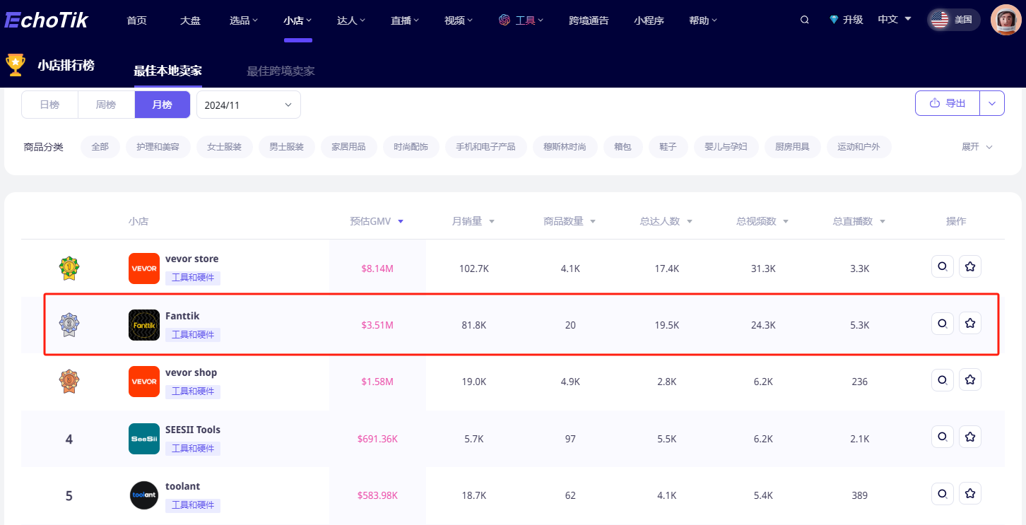 凭借这样的产品实力,Fanttik在TikTok上单月GMV高达351万美元,成为TikTok工具与硬件类目的第二名。