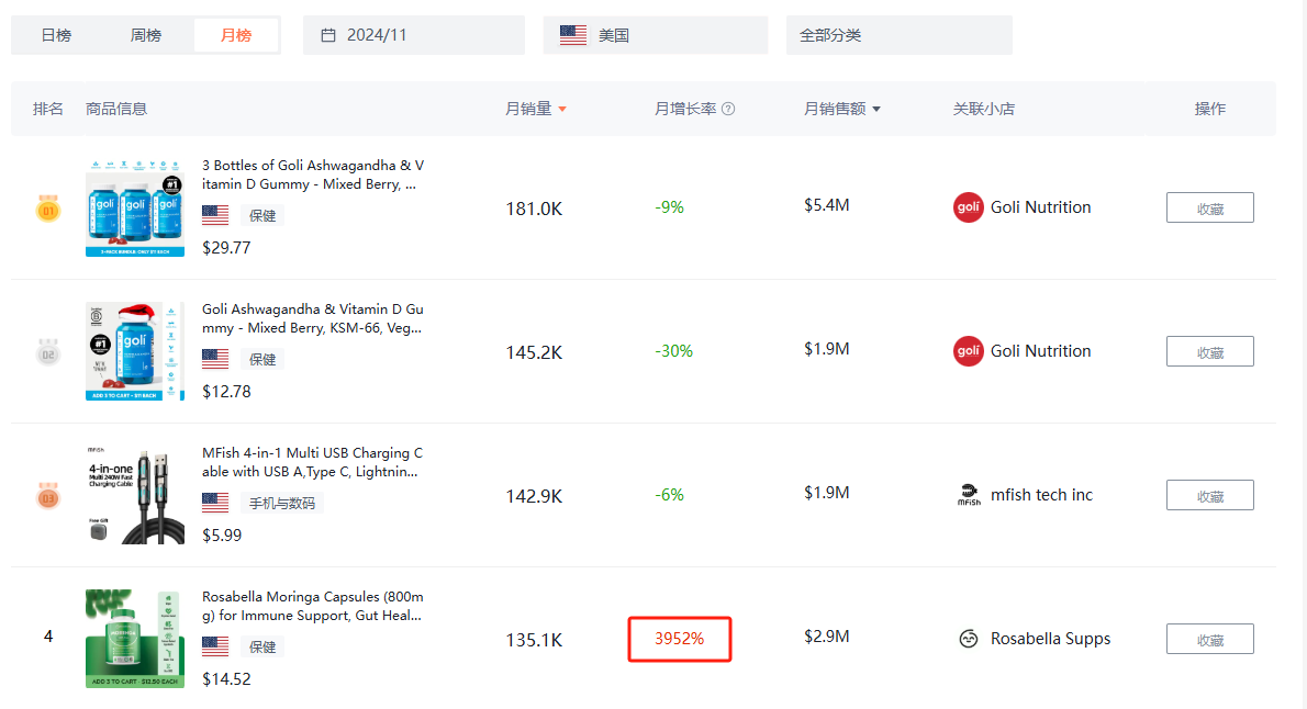 11月,Rosabella品牌通过TikTok小店@Rosabella Supps斩获了极好的“战绩”,月销暴涨3952%,达到13.51万件,月销售额为290万美元,折合约2116.36万人民币。