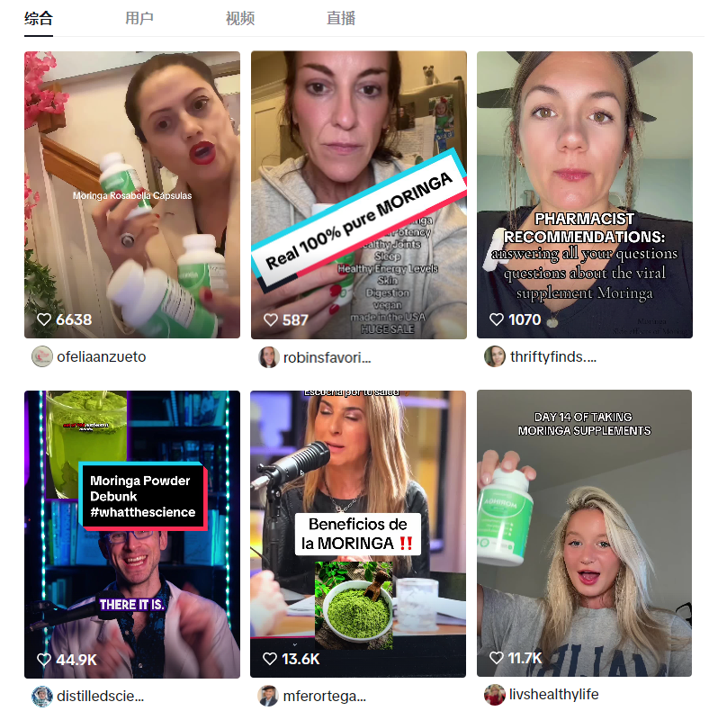 TIkTok上搜索“MORINGA”出现的内容