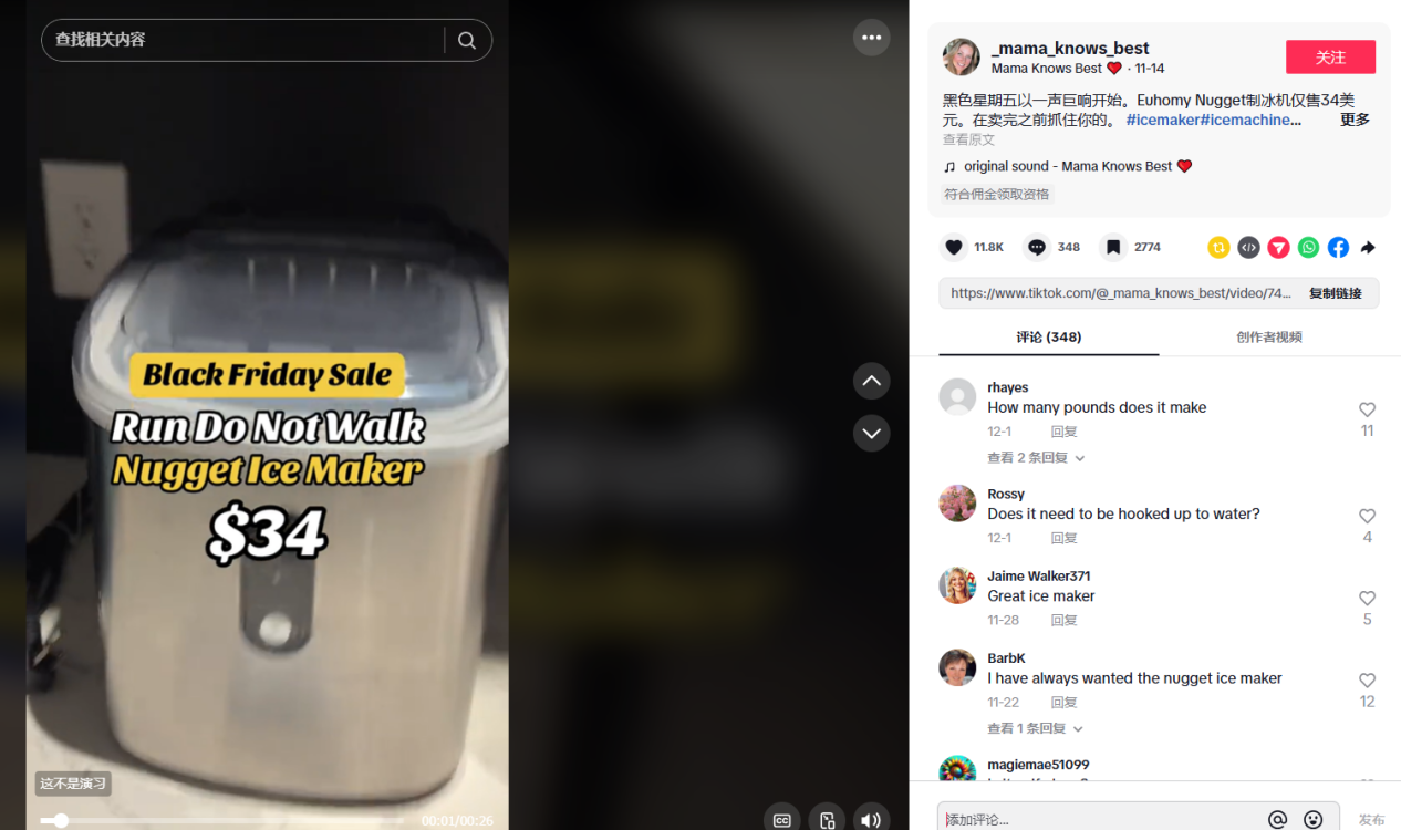 让它爆火的契机是一段仅26秒的视频。视频中,博主兴奋地安利这款“黑五必买好物”,还特意强调了其快速制冰、便携性强等特点。这种直击痛点的推荐方式,让不少网友在评论区狂求购买链接。视频发布一个多月后,观看量已飙升至440万+,点赞数破万,而这款制冰机正是EUHOMY店铺的当家爆款。