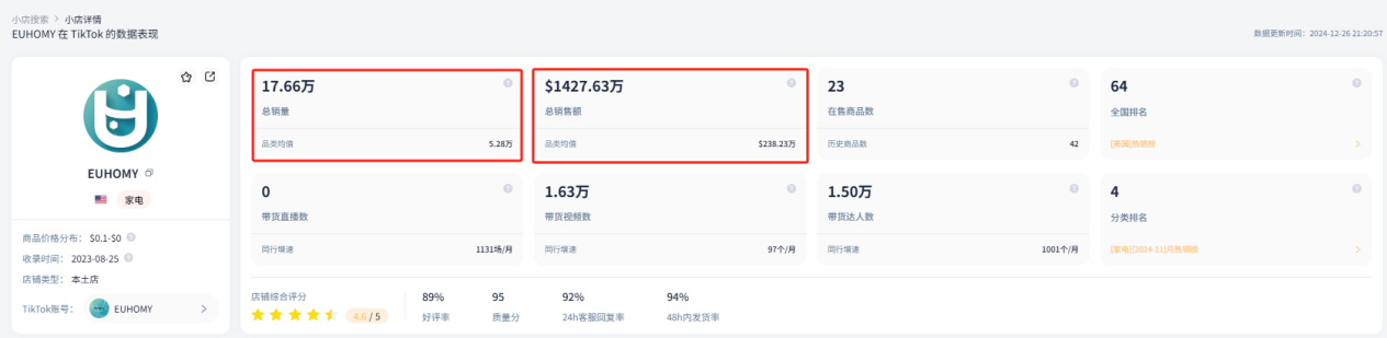 在刚刚过去的黑五大促中,TikTok Shop美区迎来了一波“购物狂潮”,整体销售额突破1亿美元,黑五和网络星期一两天的购物者同比增长了165%。其中,EUHOMY也从这波流量中成功分得了一杯羹,成绩非常亮眼。根据FastMoss的数据,在过去28天内,EUHOMY店铺的销量已经达到3.87万单,总销售额突破242万美元。
