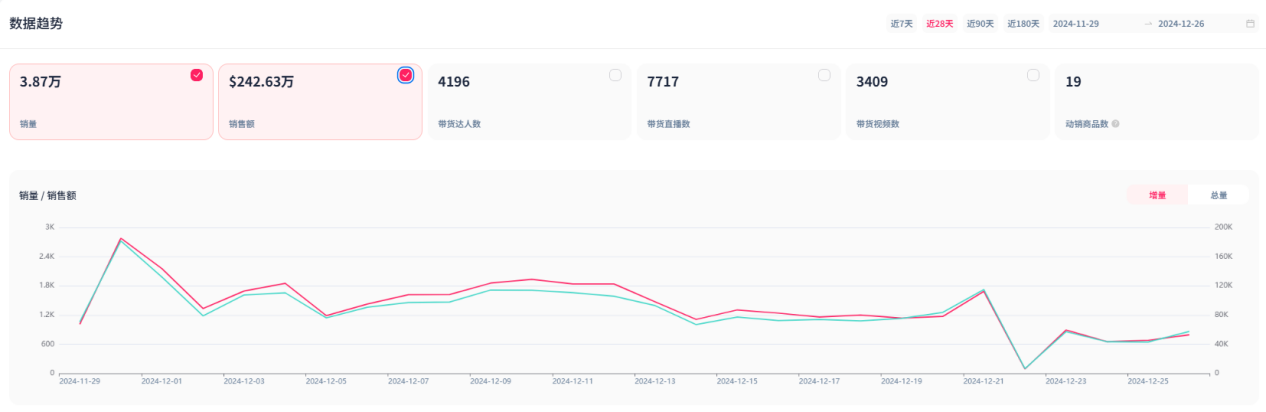 从操作上看,EUHOMY的主力营销手段依然是直播和视频带货。在过去28天里,品牌共进行了7717场直播带货,视频带货则达到了3400多场。从这些数据来看,视频带货的表现尤为突出,尤其是那些中部和尾部的达人,他们通过创意十足的内容引导观众购买,证明了即便是粉丝量相对较小的达人,也能产生强大的带货效果。