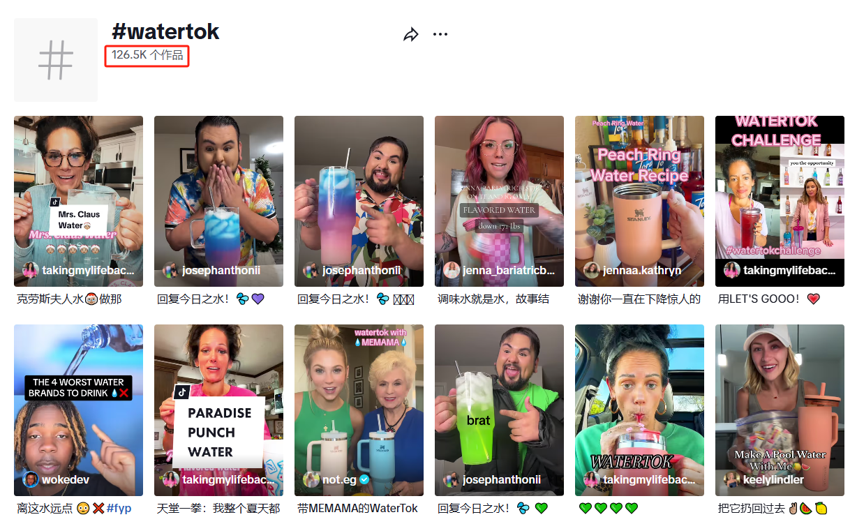 但也不是所有的营销都靠打折和促销,EUHOMY在视频内容的创意上也做足了功夫。比如,针对美国市场的消费习惯,美国人普遍不爱喝纯水,TikTok上有个非常火的#watertok话题,专门教人如何多喝水。EUHOMY合作的达人们就结合这个话题,做了很多创意视频,展示如何用便携式制冰机制作五颜六色的冰块,把冰块和饮品的颜值提升到新高度,吸引了大量喜欢“高颜值”饮品的年轻人购买。