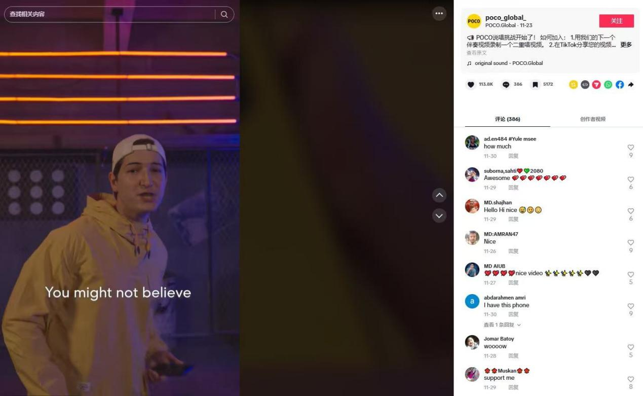 在TikTok上,POCO品牌没有单纯地宣传产品的硬件性能,而是聚焦生活化、场景化的内容,比如发起#POCORapChallenge挑战赛,鼓励用户创作短视频,用POCO手机展现自己的生活片段。这种创意挑战不仅让用户玩得尽兴,也让POCO品牌在全球范围内“圈粉”无数。