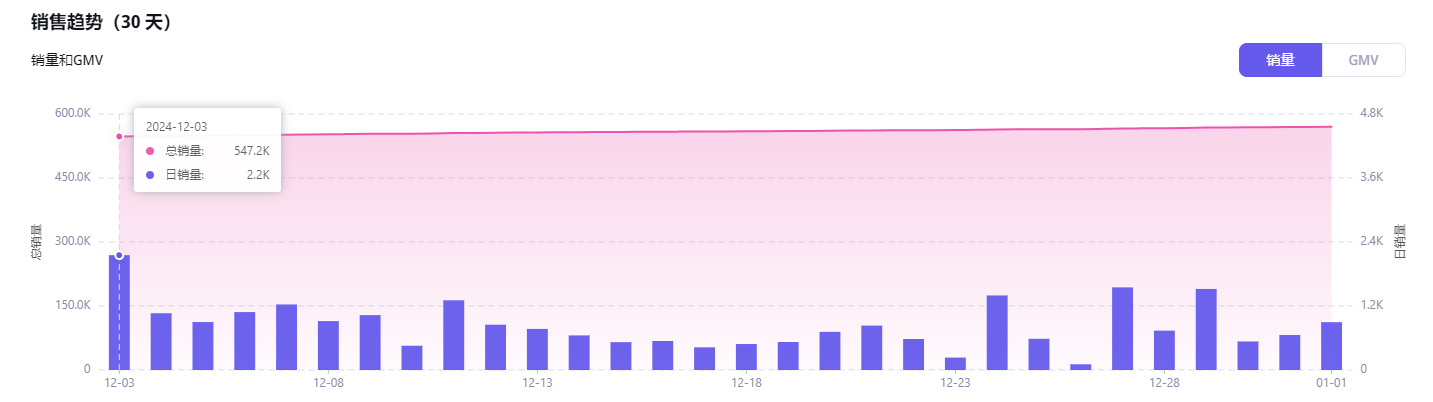 据第三方平台的数据,我们可以看到,近30天内MySmile小店的单日销量峰值达2200单,总销量突破547200单,总销售额超过16.85百万美元(折合人民币约1亿2000多万)。