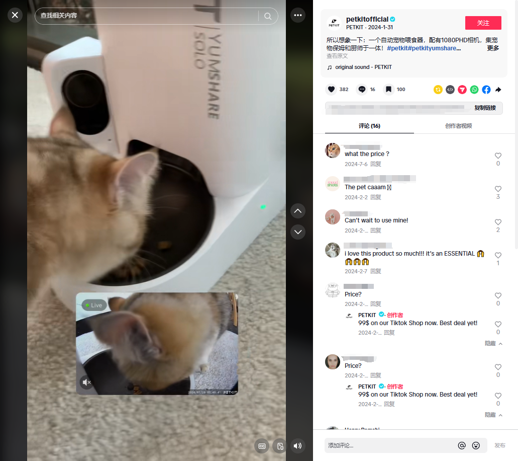 PETKIT在TikTok上用了一种特别直接的内容策略:拍宠物吃饭的可爱瞬间,同时展示喂食机如何通过手机操作进行自动喂食。视频没什么复杂技巧,就是用萌宠吸引眼球,再通过简单场景展示产品功能。最终,PETKIT靠这个策略单条视频播放量轻松过万。