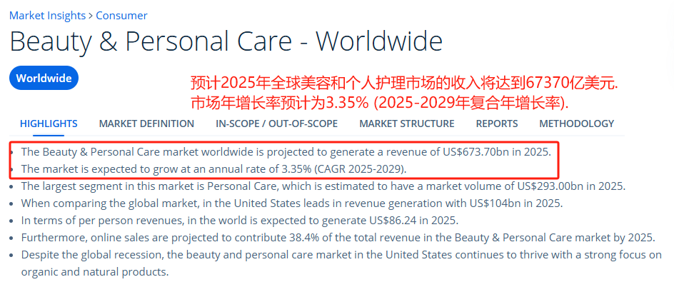 据statista数据显示,2025年全球美容及个护市场预计将达到6737亿美元,而且每年还会以3.35%的速度稳步增长。可以说,化妆品早已成了生活里的“刚需”。
