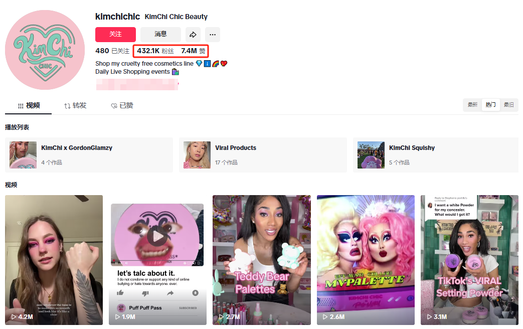 除了达人合作带货,KimChi Chic Beauty的账号运营也做得不错。该品牌的TikTok官方账号@kimchichic,目前已经吸引了超过43.21万粉丝,点赞数接近740万,数据确实不错。