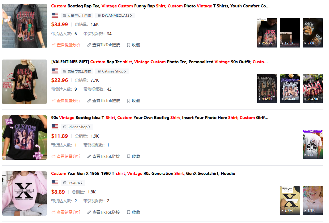 通过分析TikTok广告数据,兔克发现“定制复古T恤”(Custom Vintage Shirt)就是不错的案例,凭借独特的定位迅速俘获了大批用户的心。在TikTok上,用户热衷于展示自己的生活方式,而定制复古T恤恰好满足了这种需求。通过定制功能,用户可以选择独特的图案、配色,甚至在T恤上加入自己的名字或个性口号。这种“只属于我”的感觉,让用户更加愿意为产品买单。